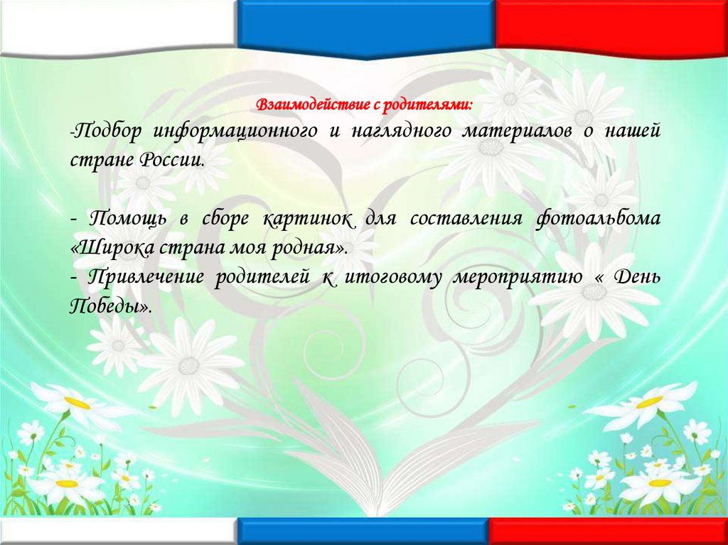 Взаимодействие с родителями:-Подбор информационного и наглядного материалов о нашей