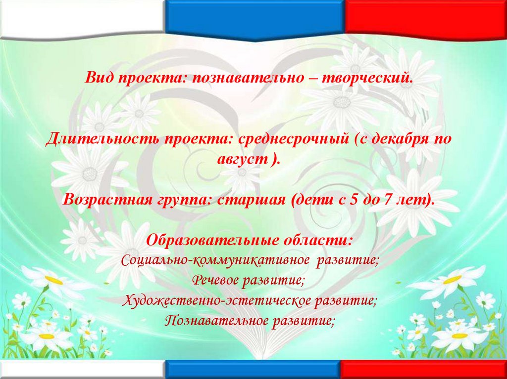 Вид проекта: познавательно – творческий.Длительность проекта: среднесрочный (с декабря по