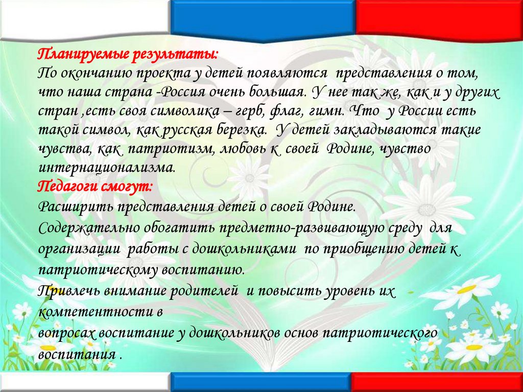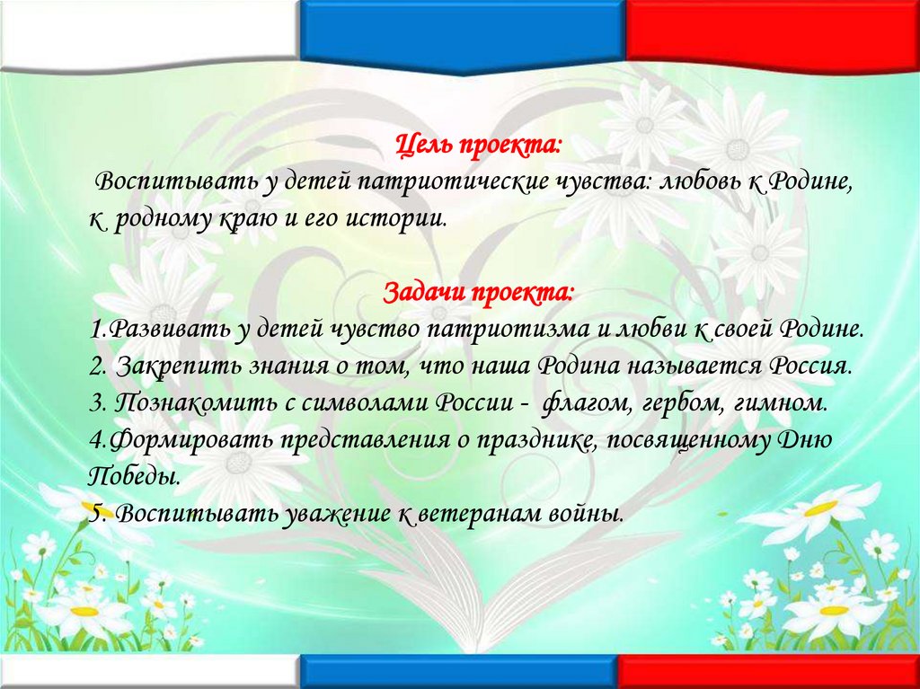 Цель проекта:Воспитывать у детей патриотические чувства: любовь к Родине,