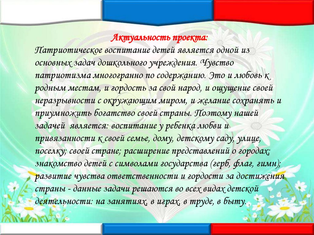 Актуальность проекта:Патриотическое воспитание детей является одной из