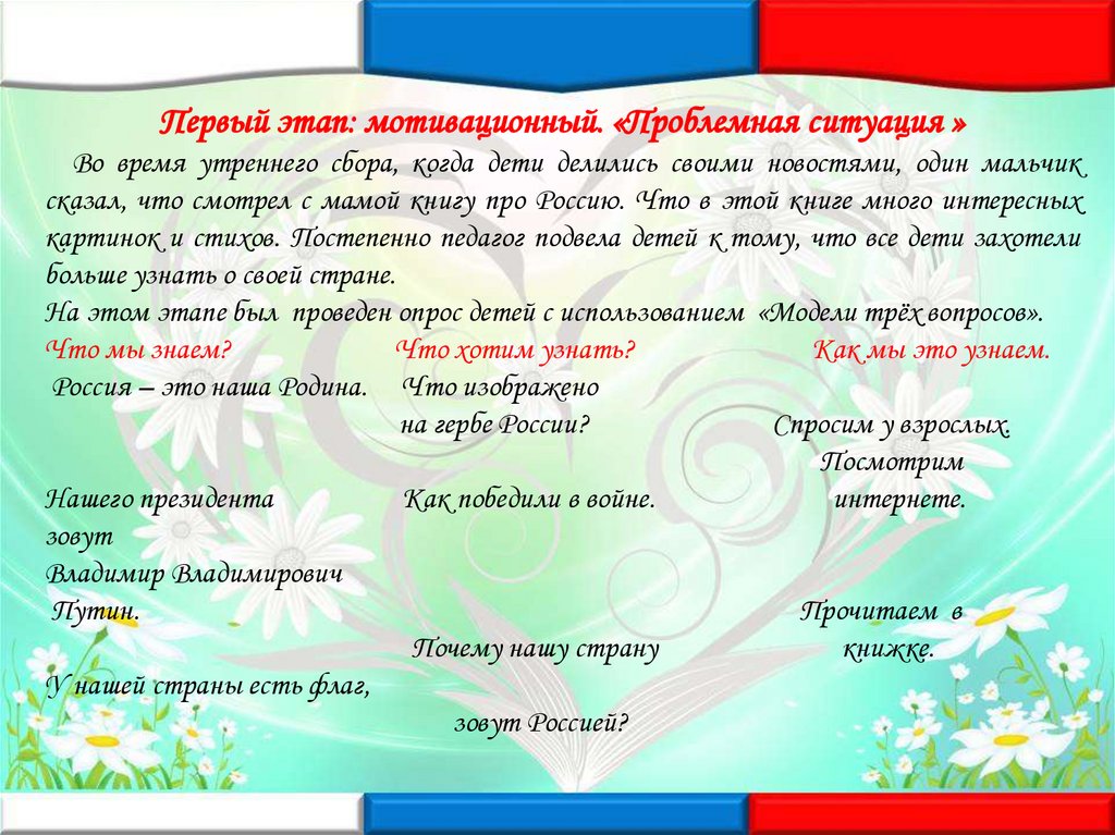 Первый этап: мотивационный. «Проблемная ситуация »Во время утреннего сбора, когда дети делились своими новостями, один мальчик