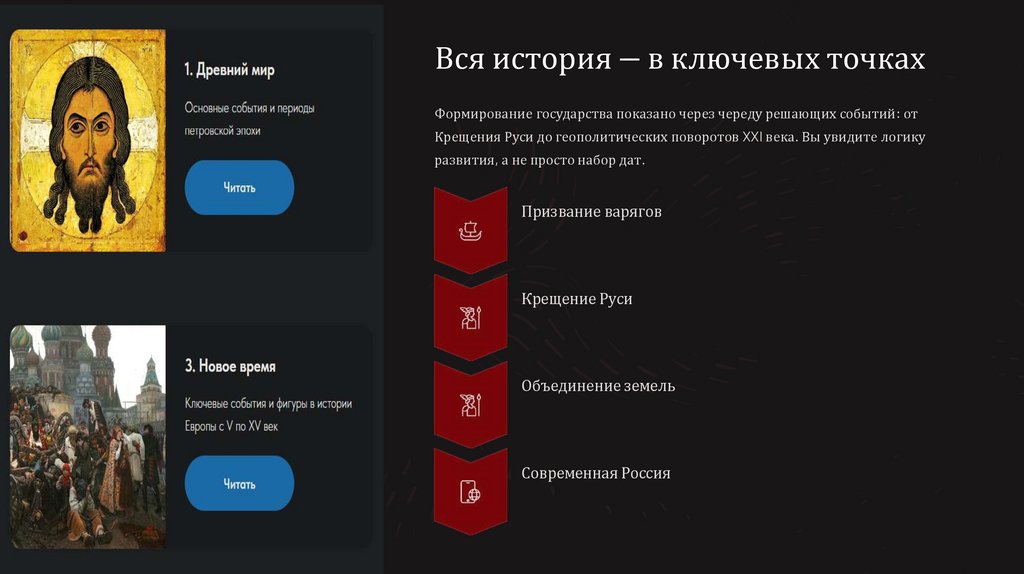 Вся история — в ключевых точкахФормирование государства показано через череду решающих событий: от