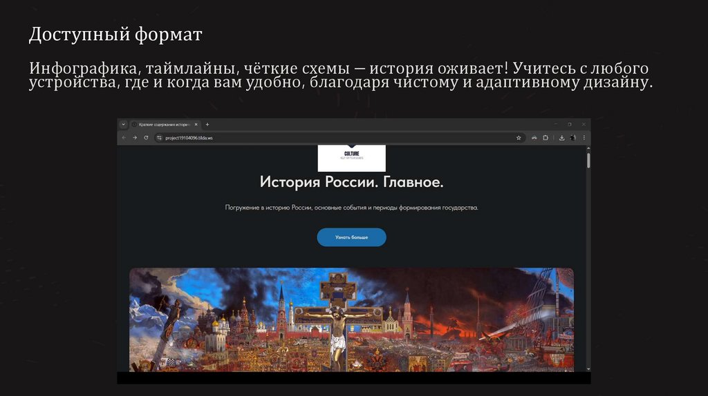 Доступный форматИнфографика, таймлайны, чёткие схемы — история оживает! Учитесь с любого