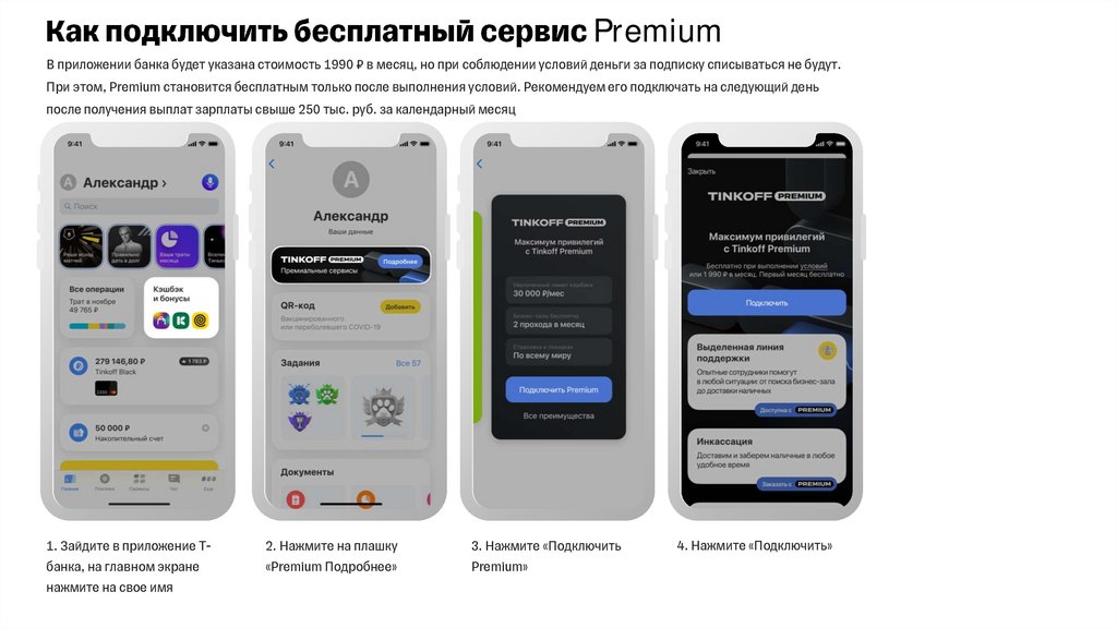 PremiumВ приложении банка будет указана стоимость 1990 ₽ в месяц, но при соблюдении условий деньги за подписку списываться не будут.