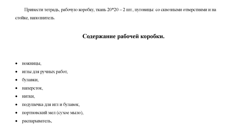 Принести тетрадь, рабочую коробку, ткань 20*20 – 2 шт., пуговицы: со сквозными отверстиями и настойке, наполнитель.