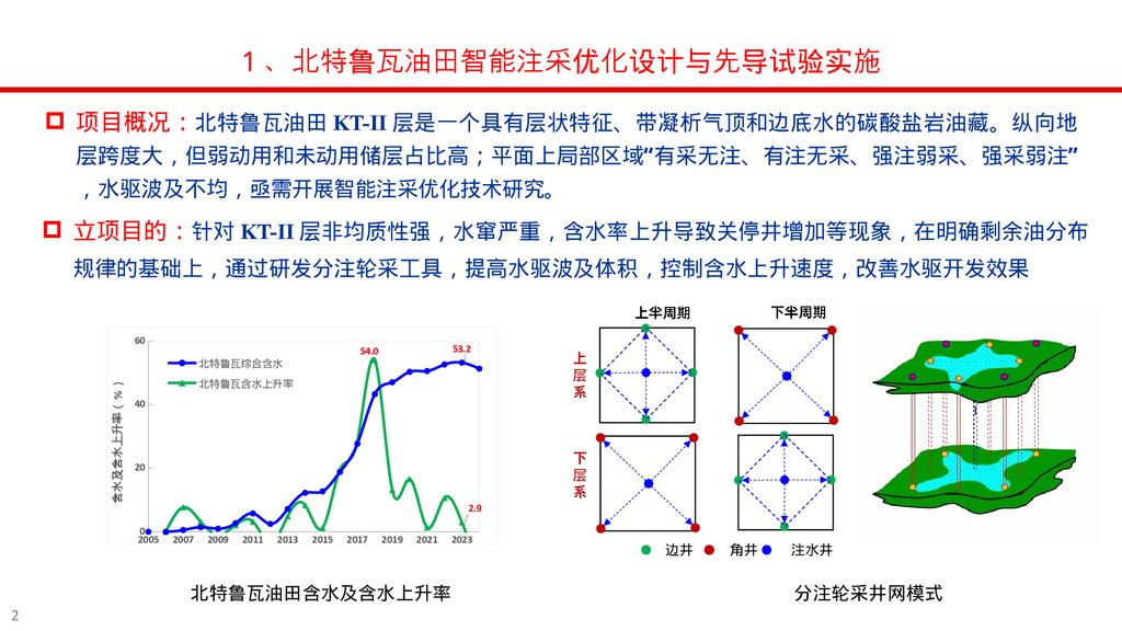 1 、北特鲁瓦油田智能注采优化设计与先导试验实施项目概况 北特鲁瓦油田 KT-II 层是一个具有层状特征、带凝析气顶和边底水的碳酸盐岩油藏。纵向地