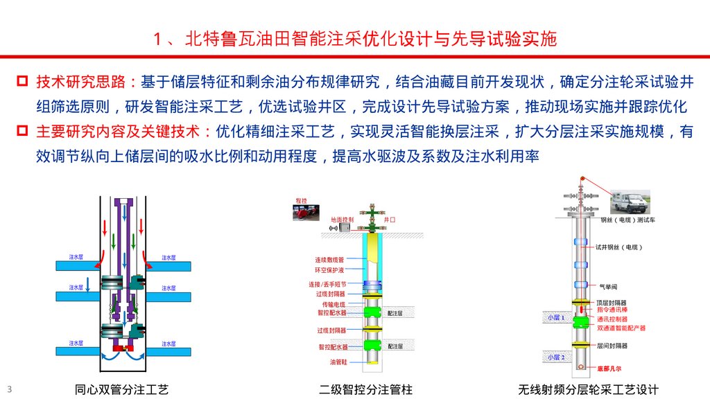主要研究内容及关键技术 优化精细注采工艺 实现灵活智能换层注采 扩大分层注采实施规模 有