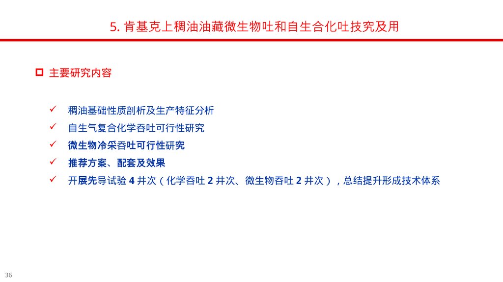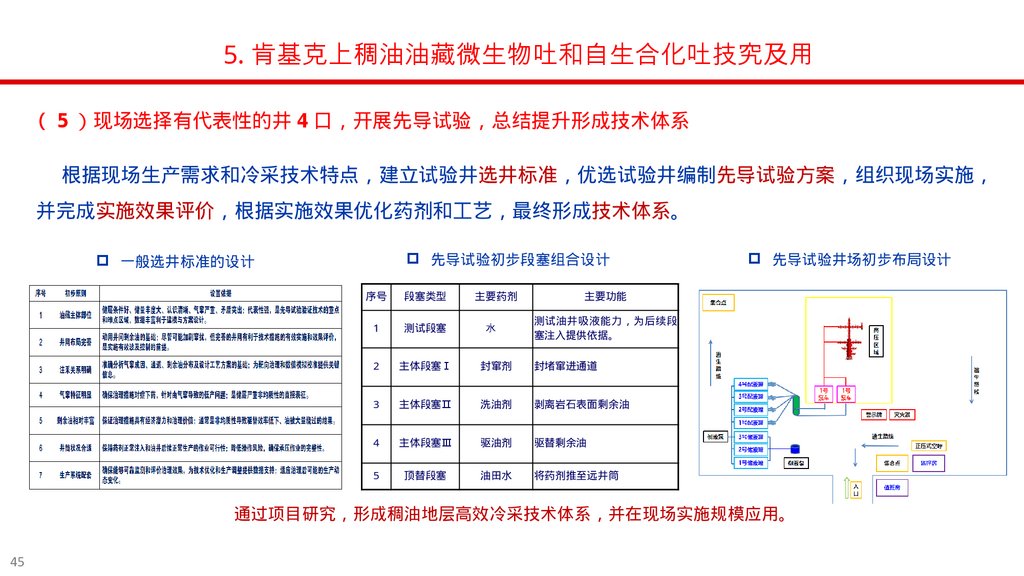 5. 肯基克上稠油油藏微生物吐和自生合化吐技究及用5 现场选择有代表性的井 4 口 开展先导试验 总结提升形成技术体系