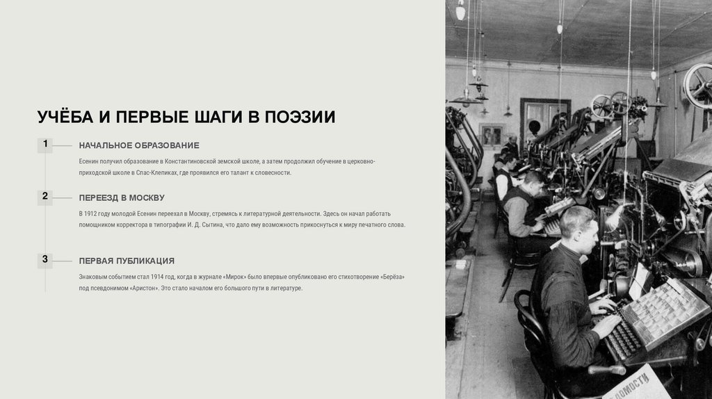 В 1912 году молодой Есенин переехал в Москву, стремясь к литературной деятельности. Здесь он начал работать