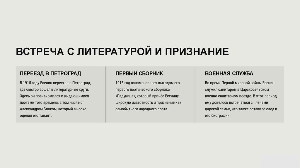 ВСТРЕЧА С ЛИТЕРАТУРОЙ И ПРИЗНАНИЕПЕРЕЕЗД В ПЕТРОГРАД