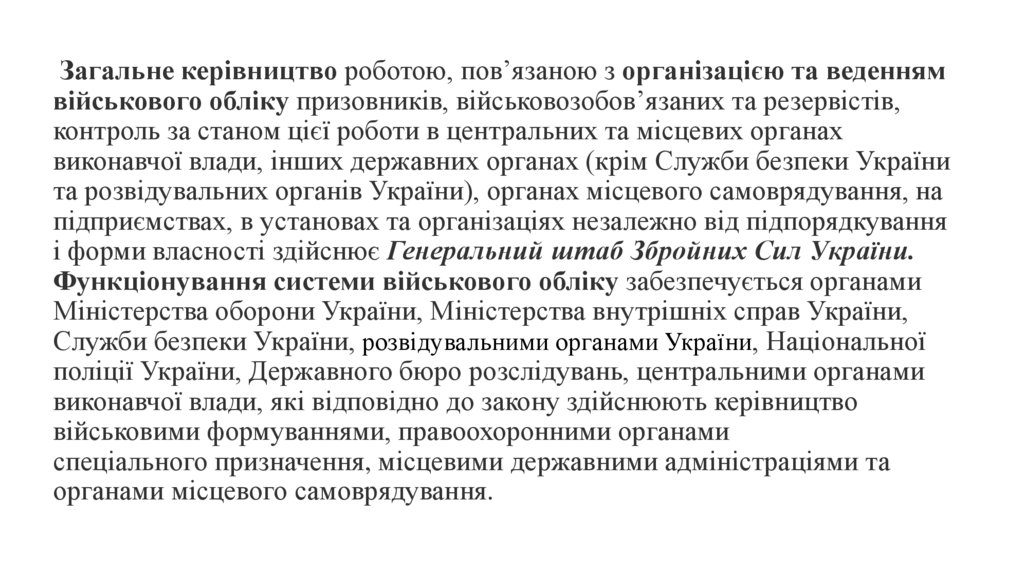 Загальне керівництво роботою, пов’язаною з організацією та веденнямвійськового обліку призовників, військовозобов’язаних та резервістів,
