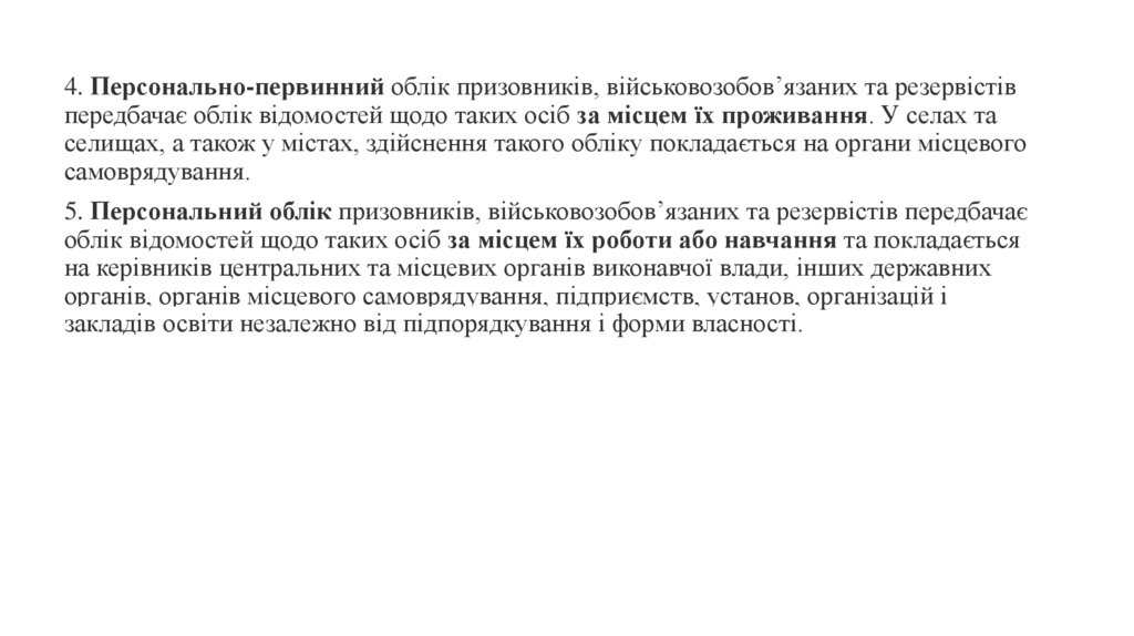 4. Персонально-первинний облік призовників, військовозобов’язаних та резервістівпередбачає облік відомостей щодо таких осіб за місцем їх проживання. У селах та