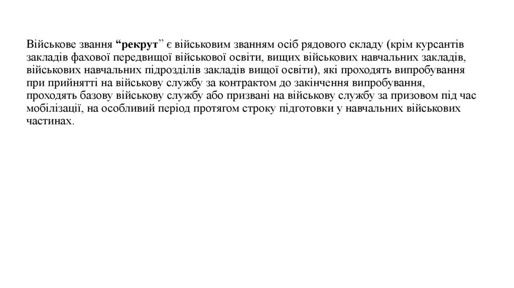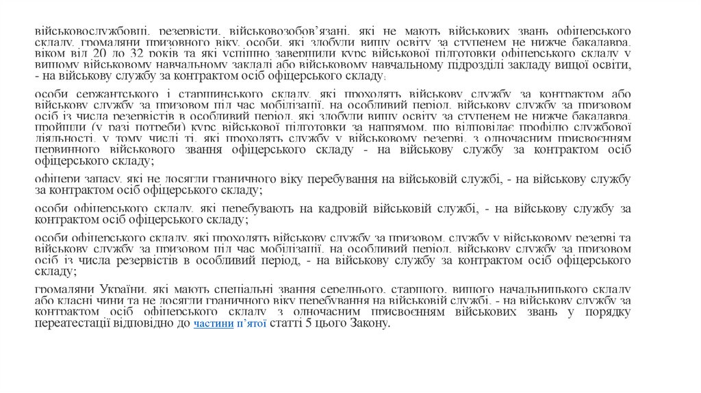 військовослужбовці, резервісти, військовозобов’язані, які не мають військових звань офіцерськогоскладу, громадяни призовного віку, особи, які здобули вищу освіту за ступенем не нижче бакалавра,