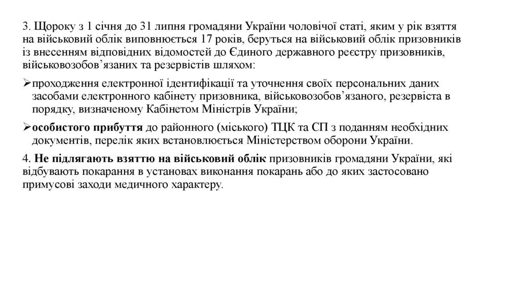 3. Щороку з 1 січня до 31 липня громадяни України чоловічої статі, яким у рік взяттяна військовий облік виповнюється 17 років, беруться на військовий облік призовників