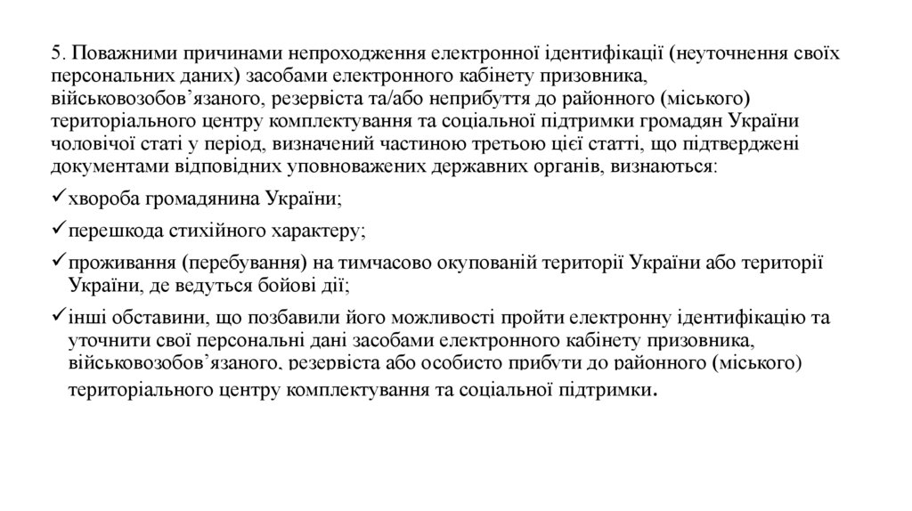 5. Поважними причинами непроходження електронної ідентифікації (неуточнення своїхперсональних даних) засобами електронного кабінету призовника,