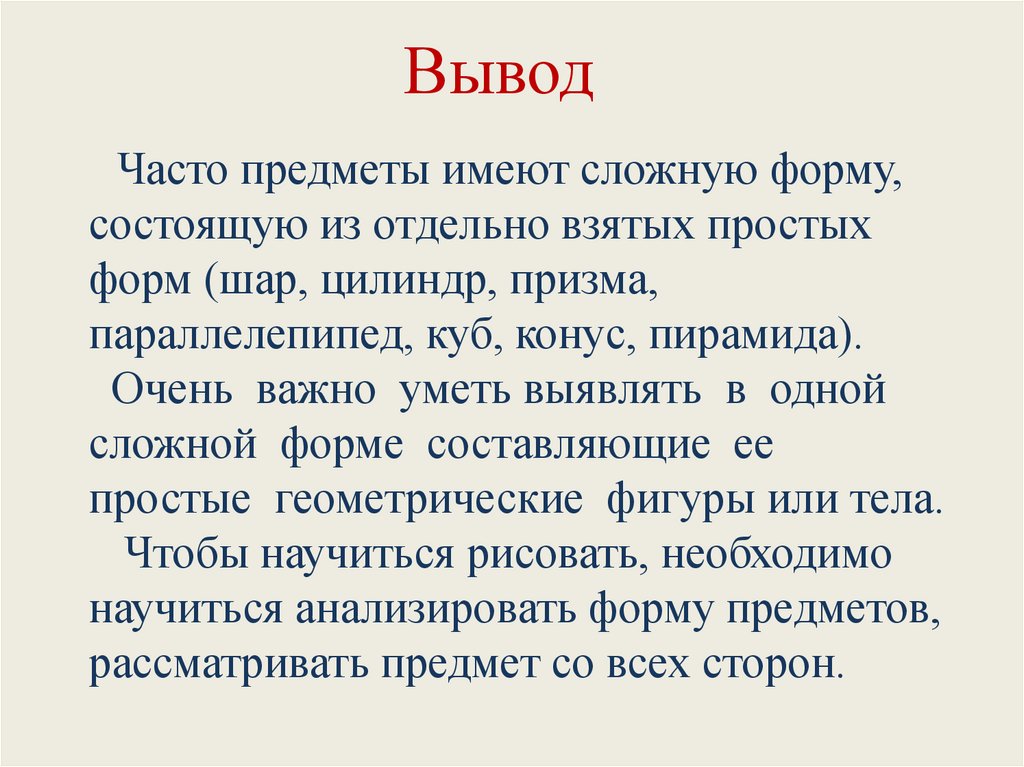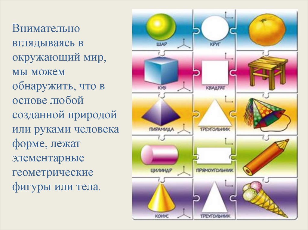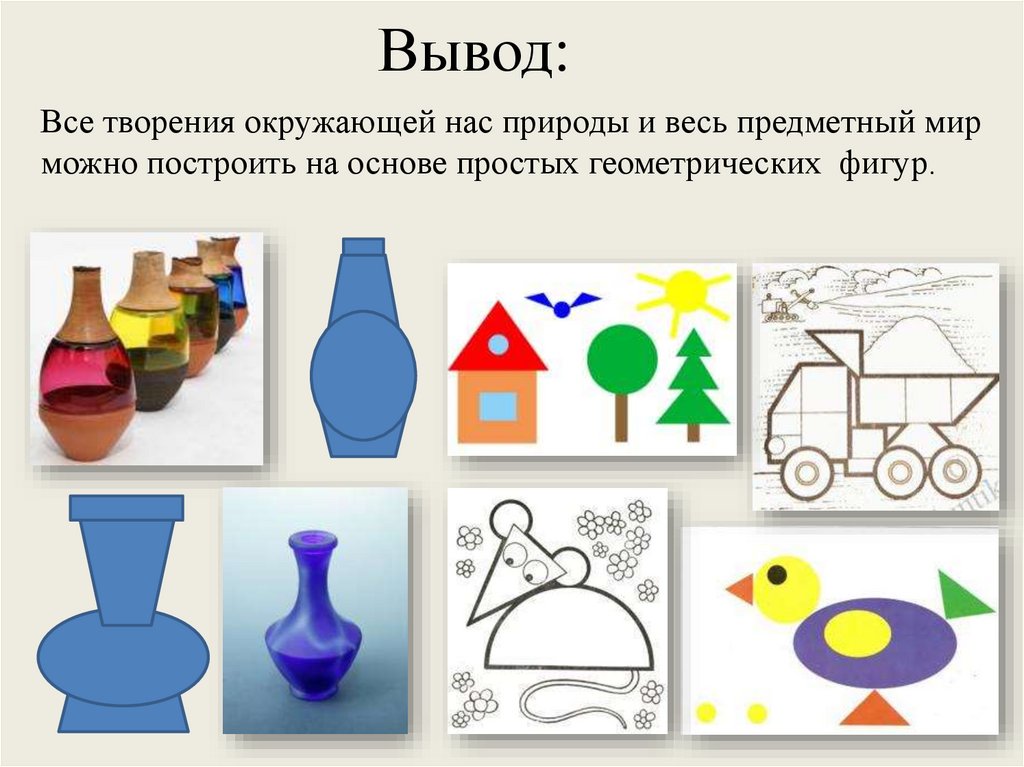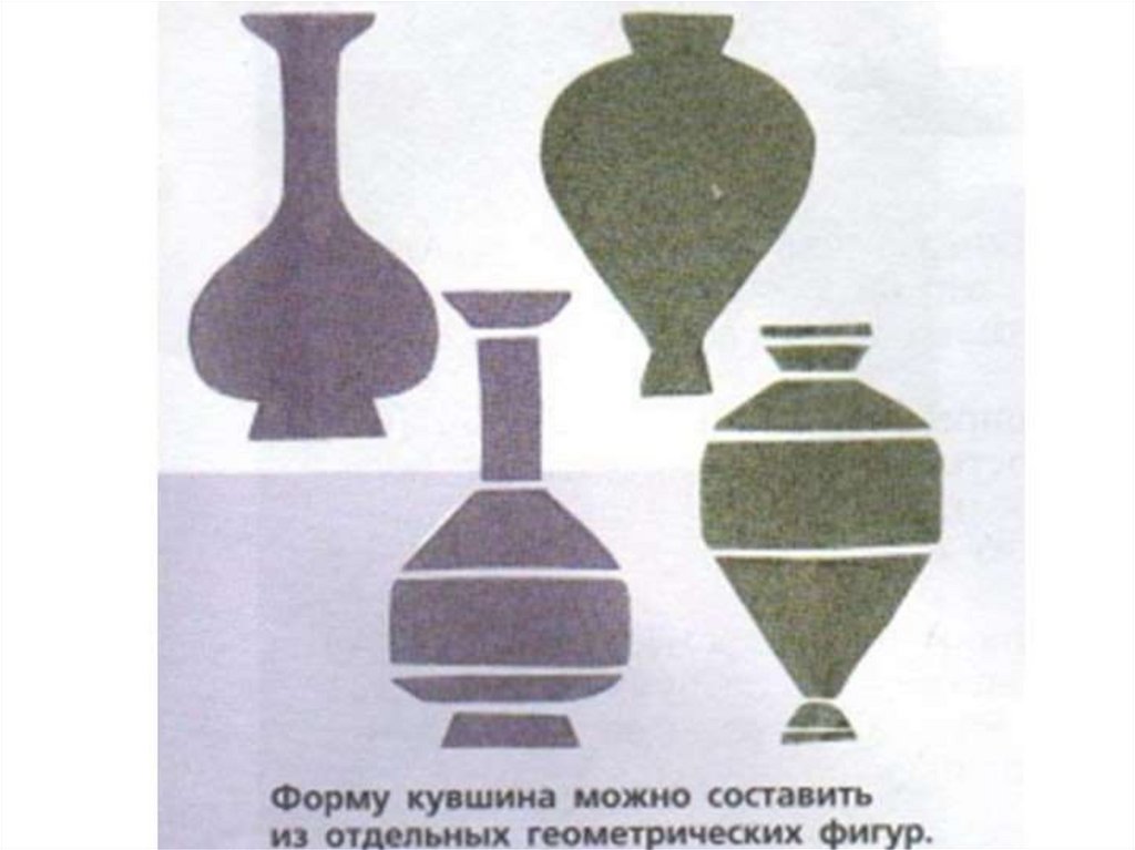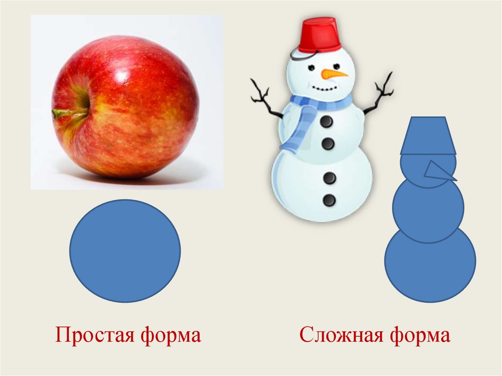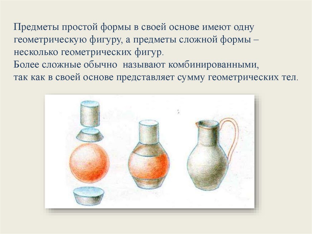 Предметы простой формы в своей основе имеют однугеометрическую фигуру, а предметы сложной формы –