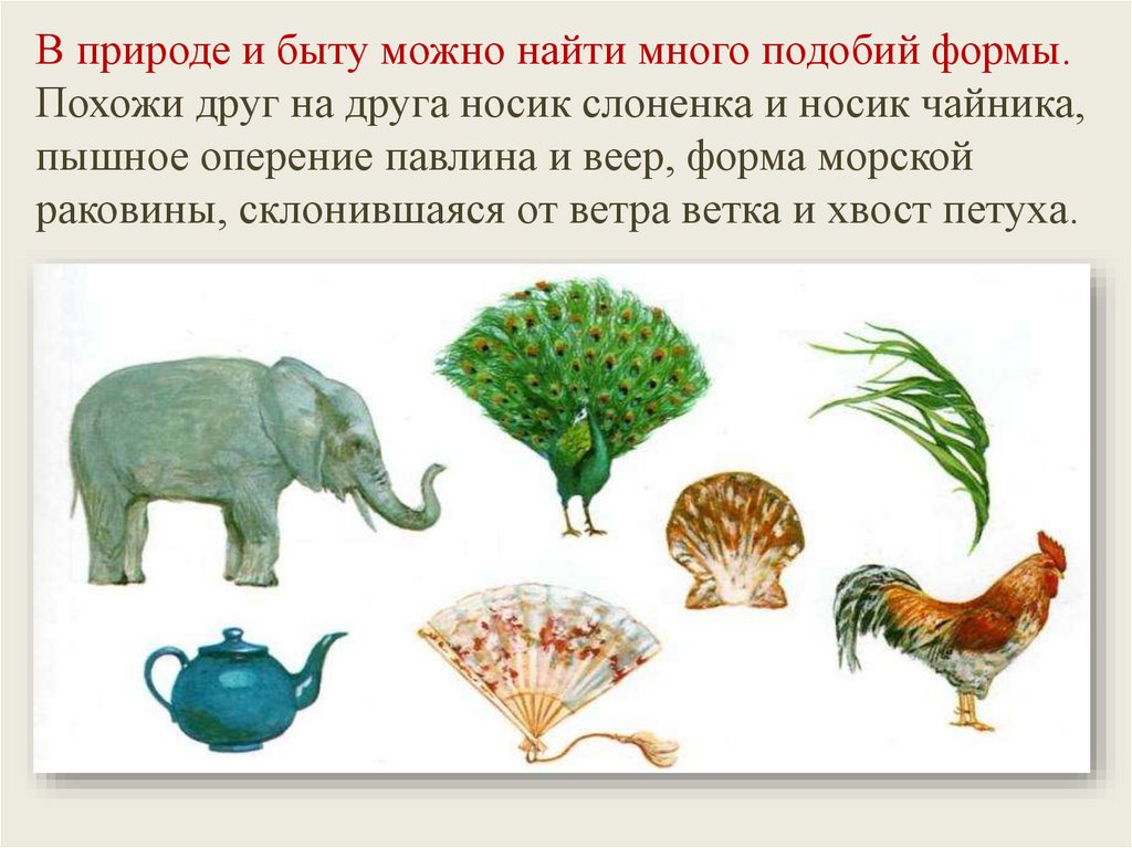 В природе и быту можно найти много подобий формы.Похожи друг на друга носик слоненка и носик чайника,