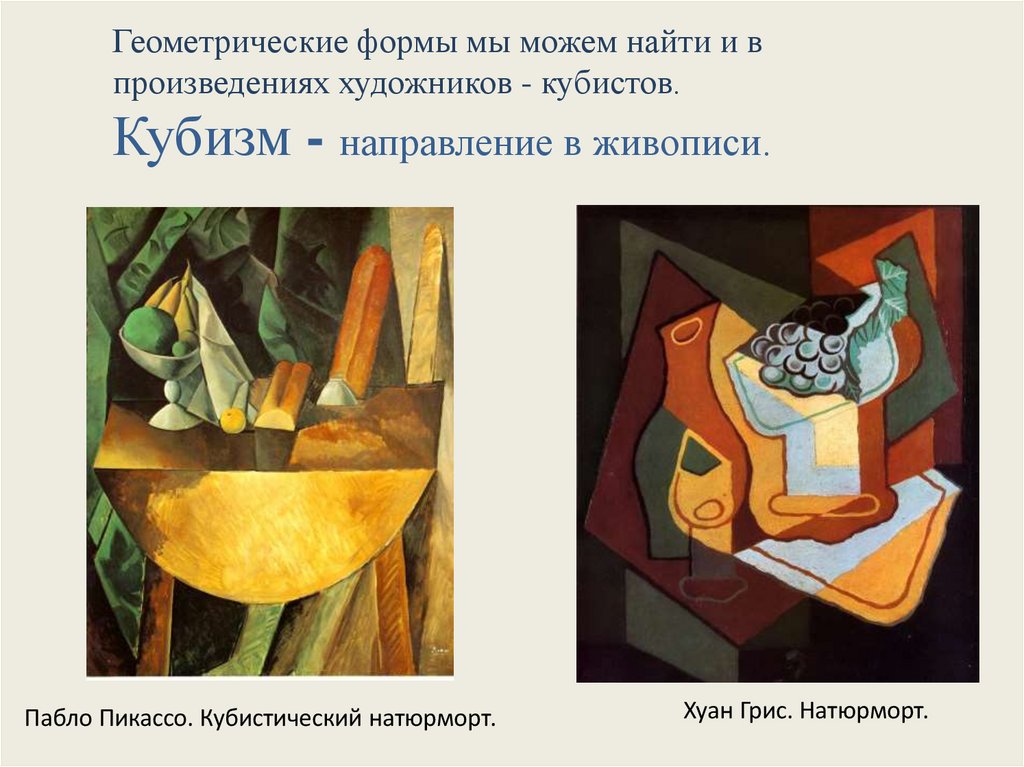 Геометрические формы мы можем найти и впроизведениях художников - кубистов.