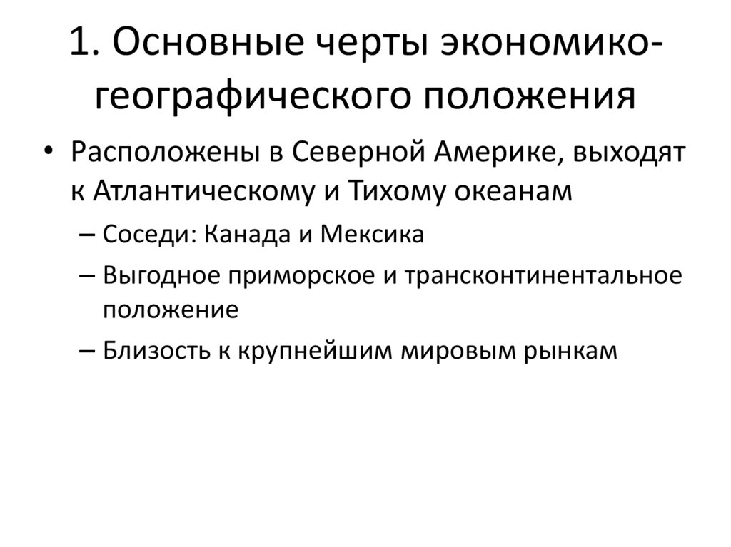 1. Основные черты экономикогеографического положения• Расположены в Северной Америке, выходят
