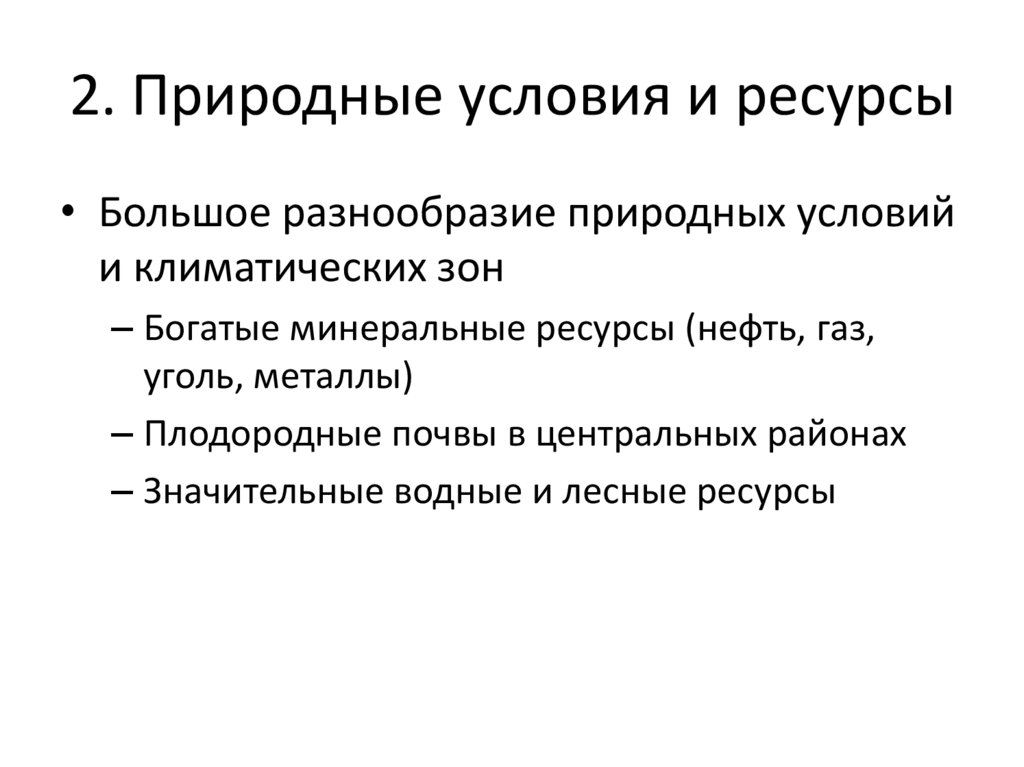 2. Природные условия и ресурсы• Большое разнообразие природных условий