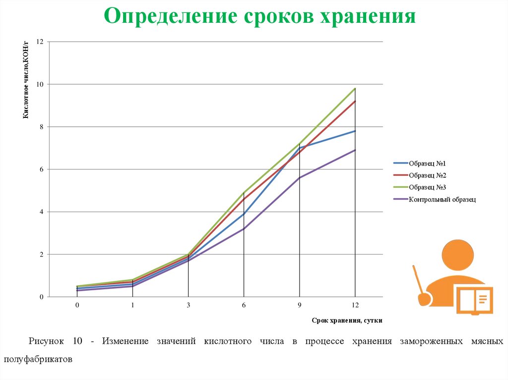 Рисунок 10 - Изменение значений кислотного числа в процессе хранения замороженных мясных