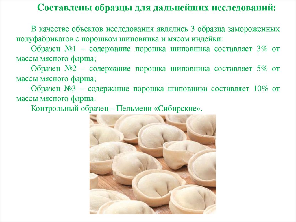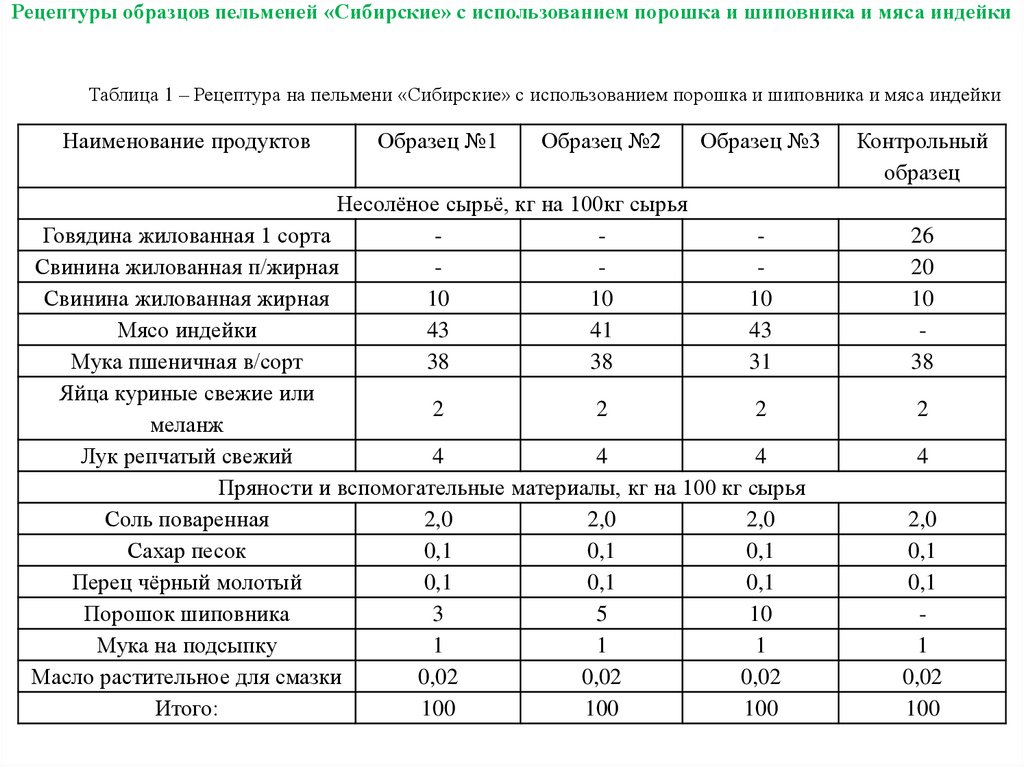 Рецептуры образцов пельменей «Сибирские» с использованием порошка и шиповника и мяса индейкиТаблица 1 – Рецептура на пельмени «Сибирские» с использованием порошка и шиповника и мяса индейки