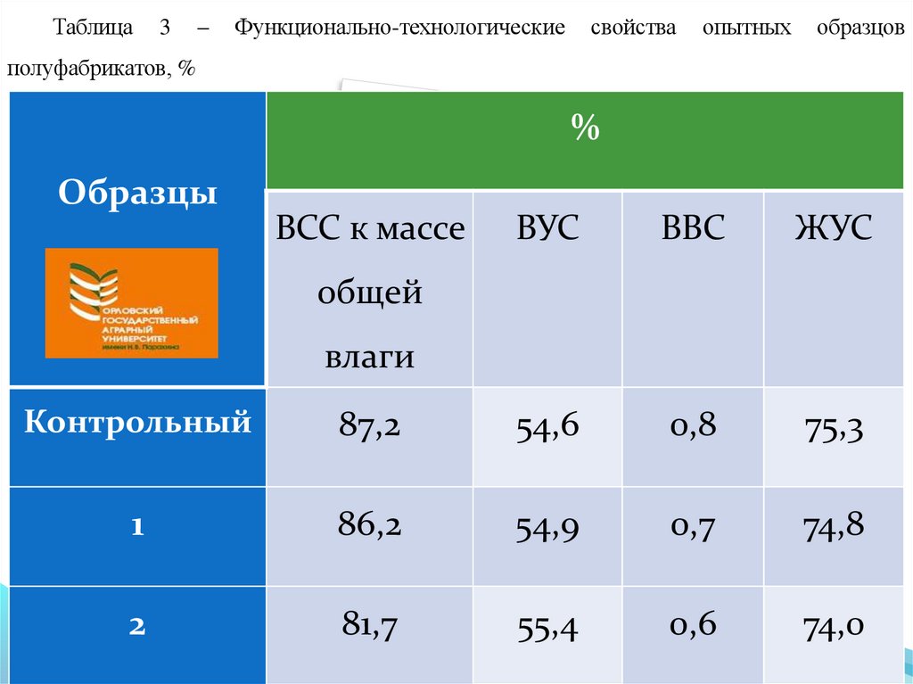 низких, но сопоставимых с контролем показателей ВСС, ВУС и ЖУС опытных образцов. Введение порошка в