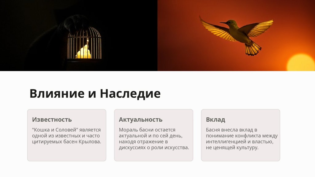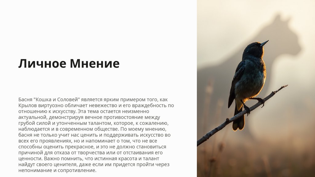 Личное МнениеБасня "Кошка и Соловей" является ярким примером того, как