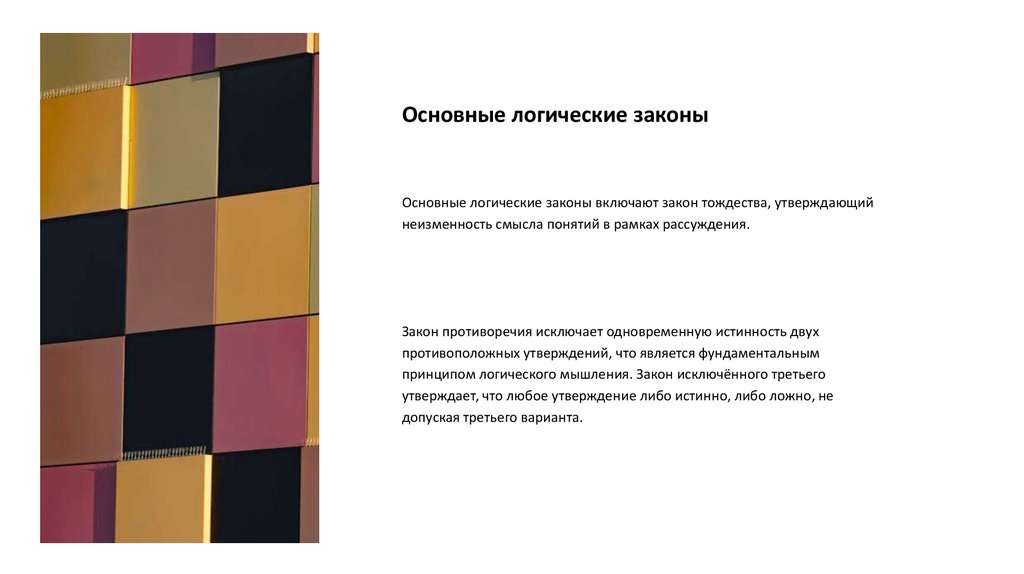 Основные логические законыОсновные логические законы включают закон тождества, утверждающий
