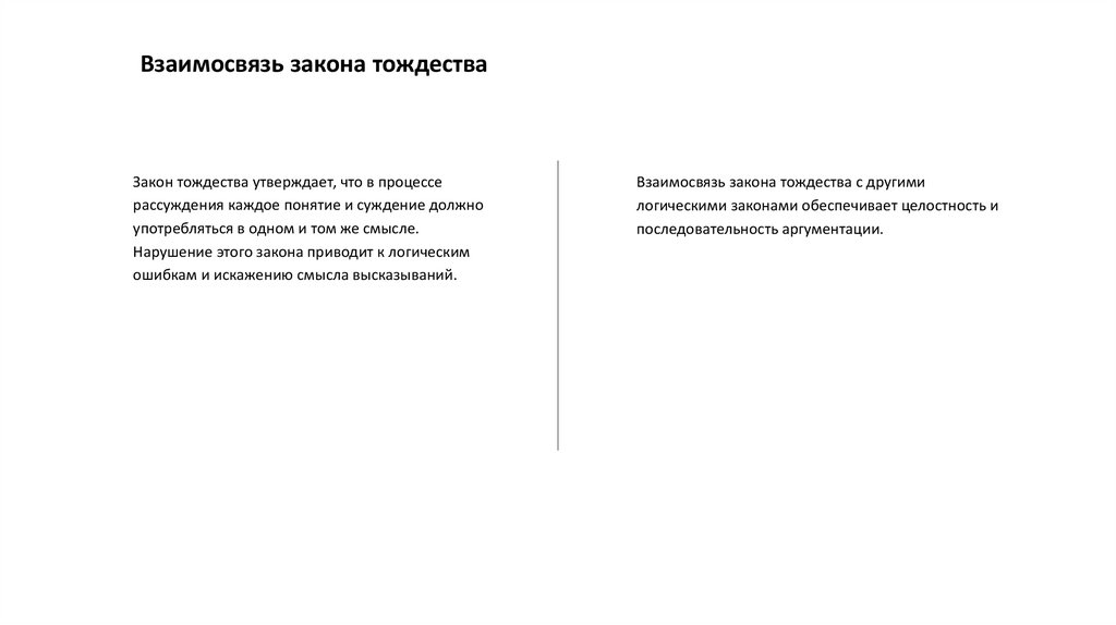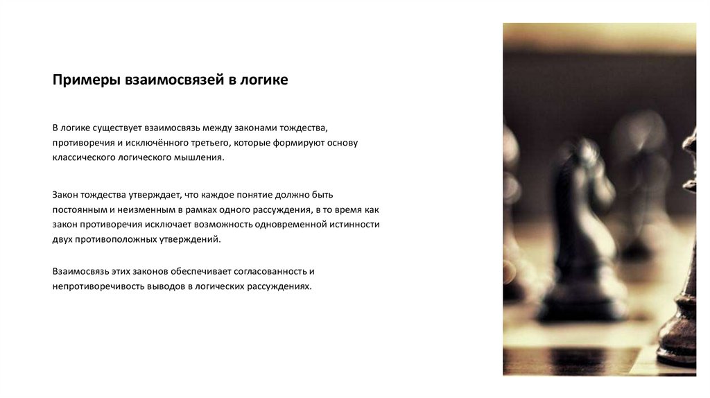 Примеры взаимосвязей в логикеВ логике существует взаимосвязь между законами тождества,