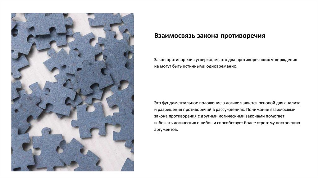 Взаимосвязь закона противоречияЗакон противоречия утверждает, что два противоречащих утверждения