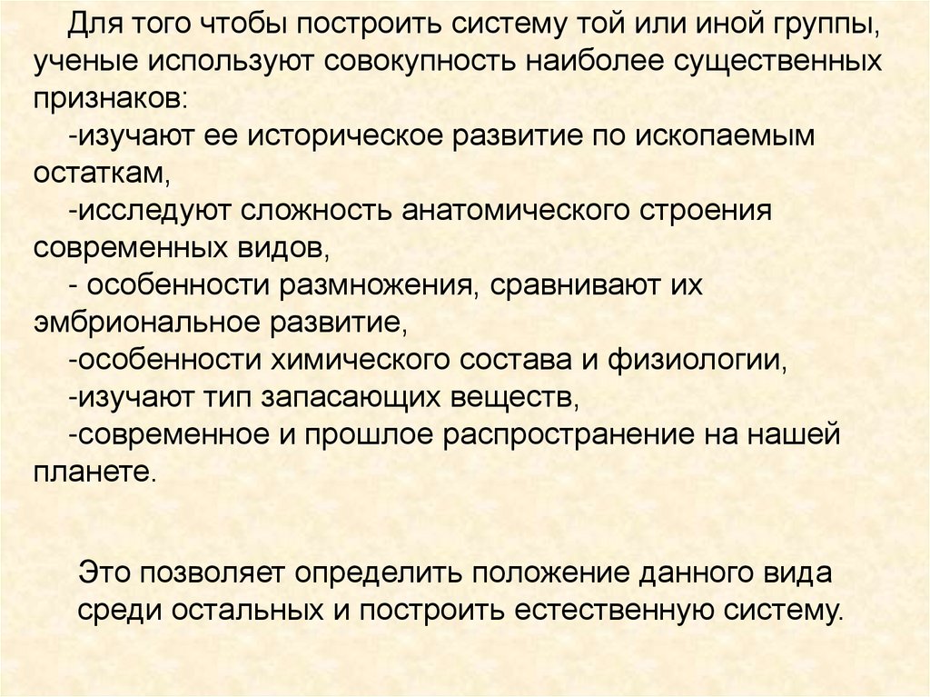 Для того чтобы построить систему той или иной группы,ученые используют совокупность наиболее существенных