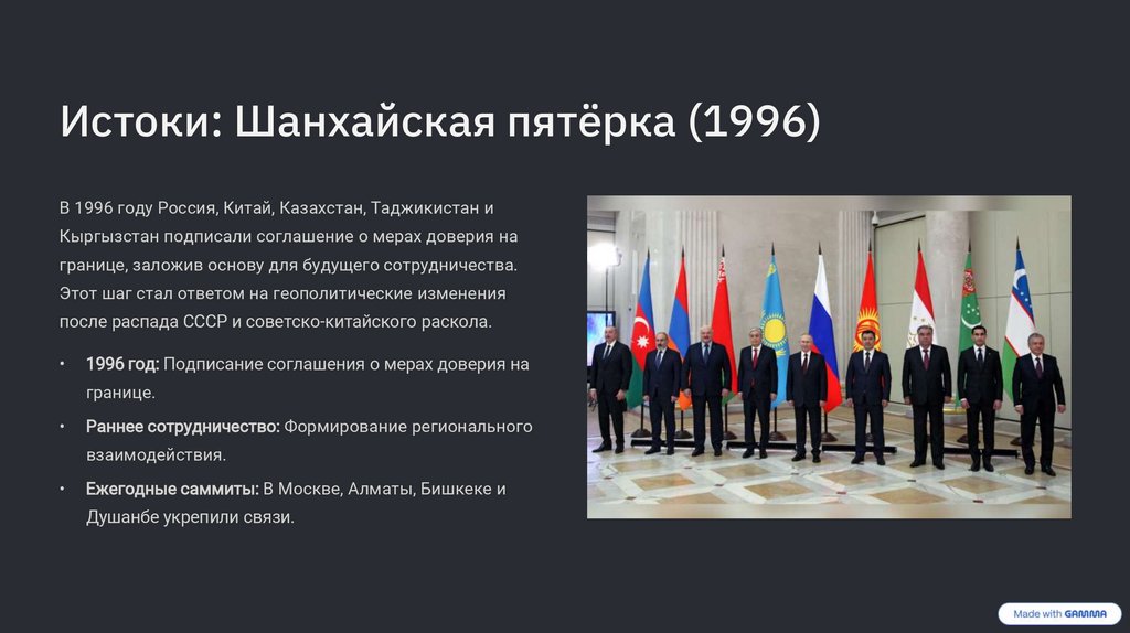 Истоки: Шанхайская пятёрка (1996)В 1996 году Россия, Китай, Казахстан, Таджикистан и