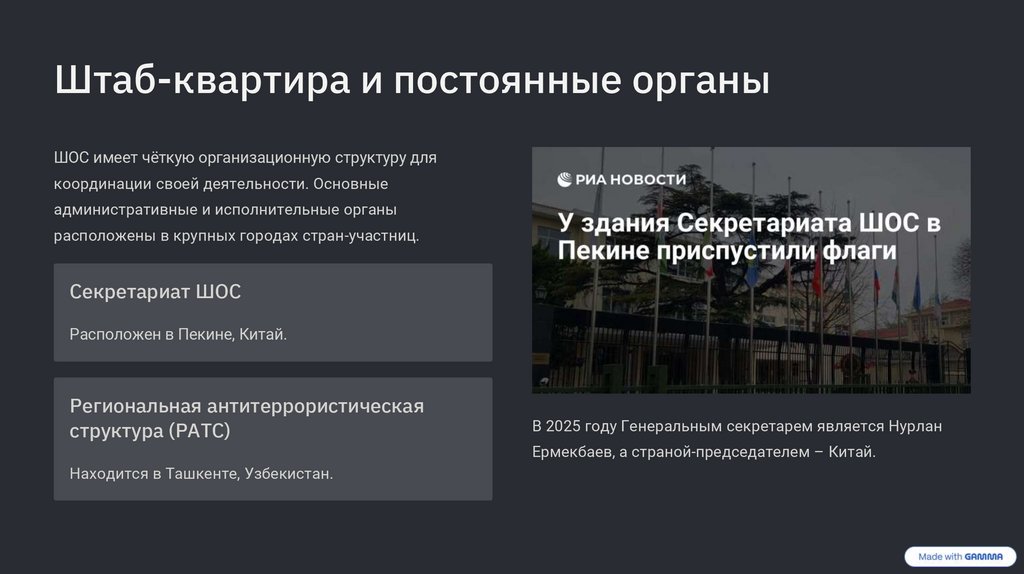 Штаб-квартира и постоянные органыШОС имеет чёткую организационную структуру для