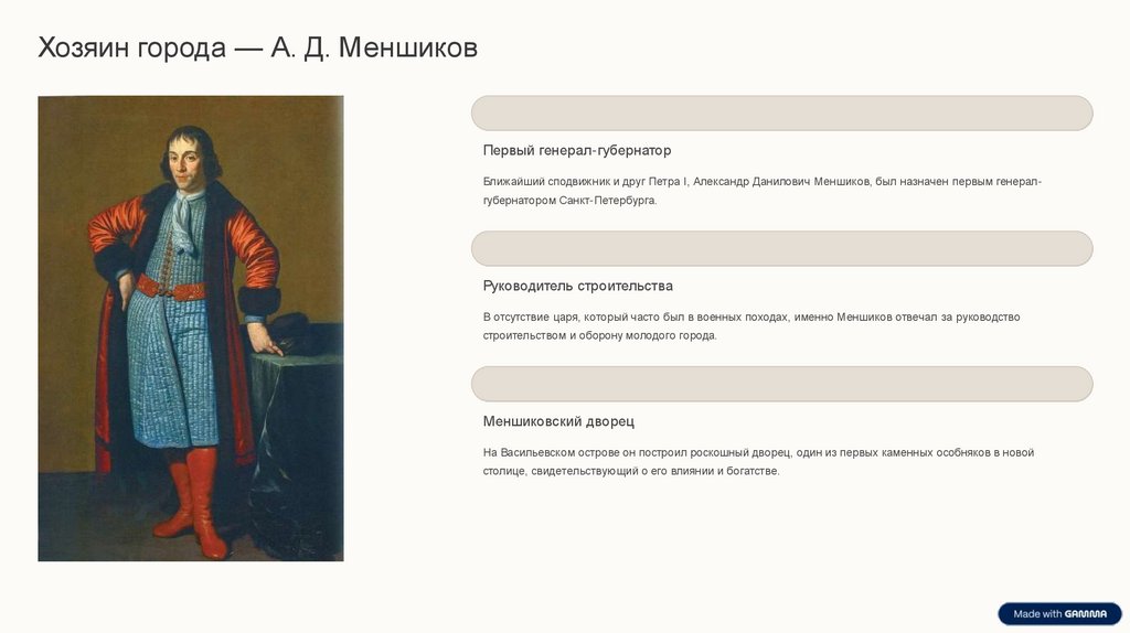 Ближайший сподвижник и друг Петра I, Александр Данилович Меншиков, был назначен первым генералгубернатором Санкт-Петербурга.
