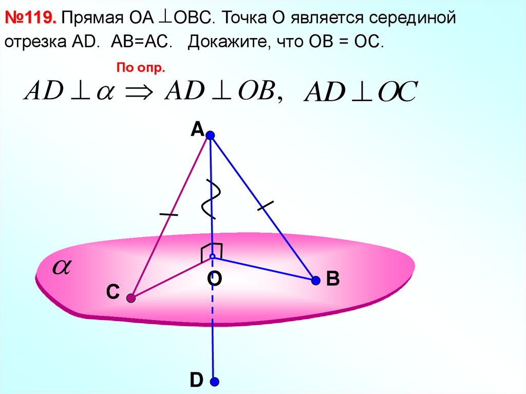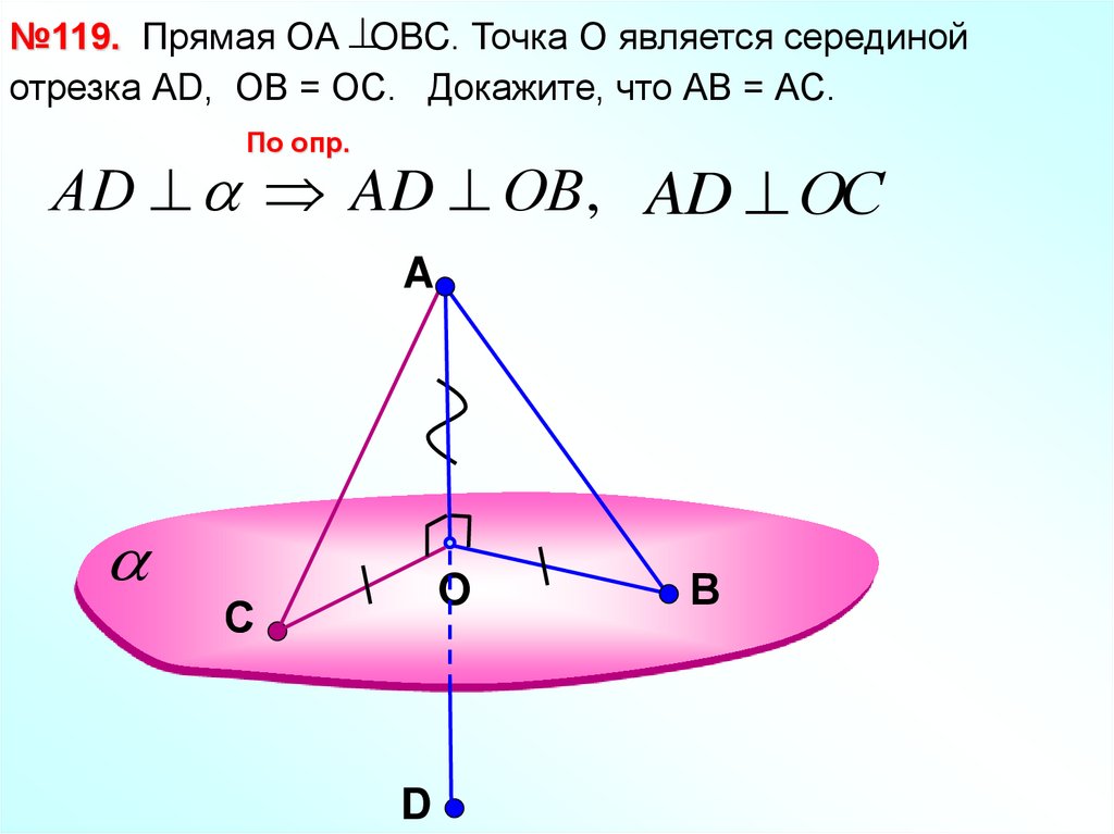 №119. Прямая ОА OBC. Точка О является серединойотрезка АD, ОВ = ОС. Докажите, что АВ = АС.