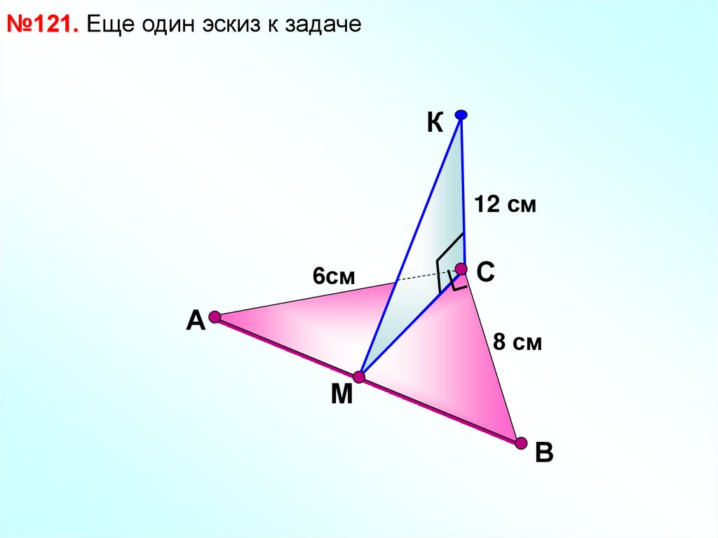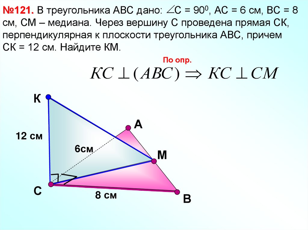 №121. В треугольника АВС дано: С = 900, АС = 6 см, ВС = 8см, СМ – медиана. Через вершину С проведена прямая СК,