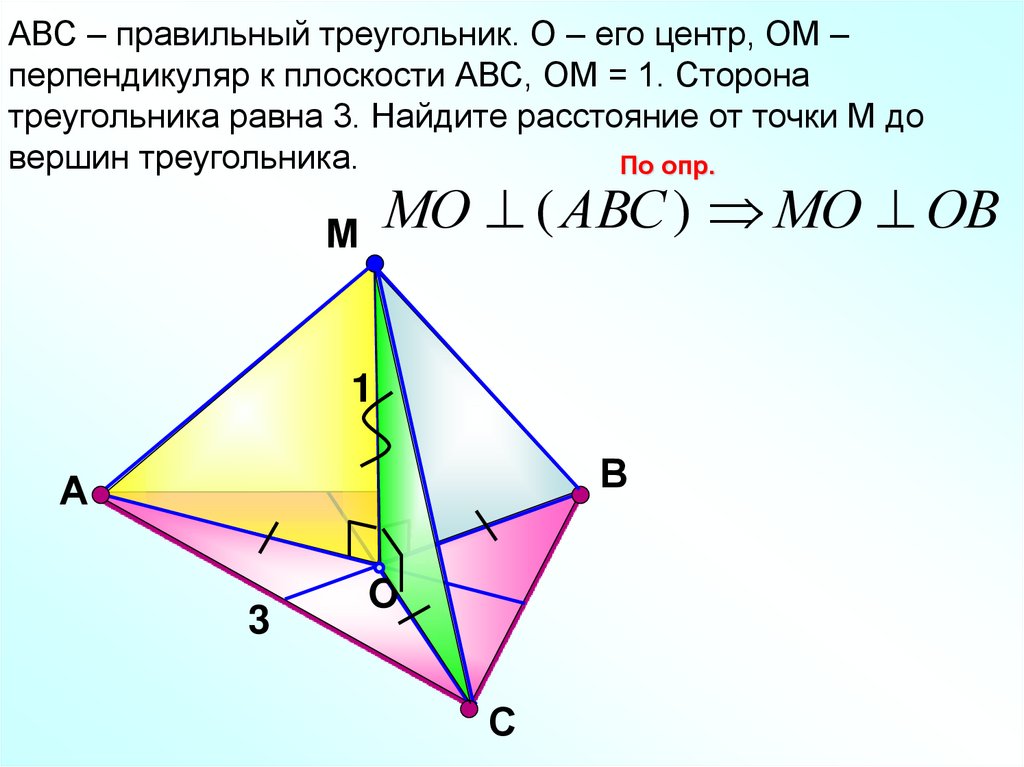 АВС – правильный треугольник. О – его центр, ОМ –перпендикуляр к плоскости АВС, ОМ = 1. Сторона