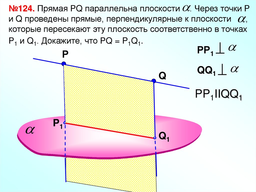 №124. Прямая РQ параллельна плоскости . Через точки Ри Q проведены прямые, перпендикулярные к плоскости ,