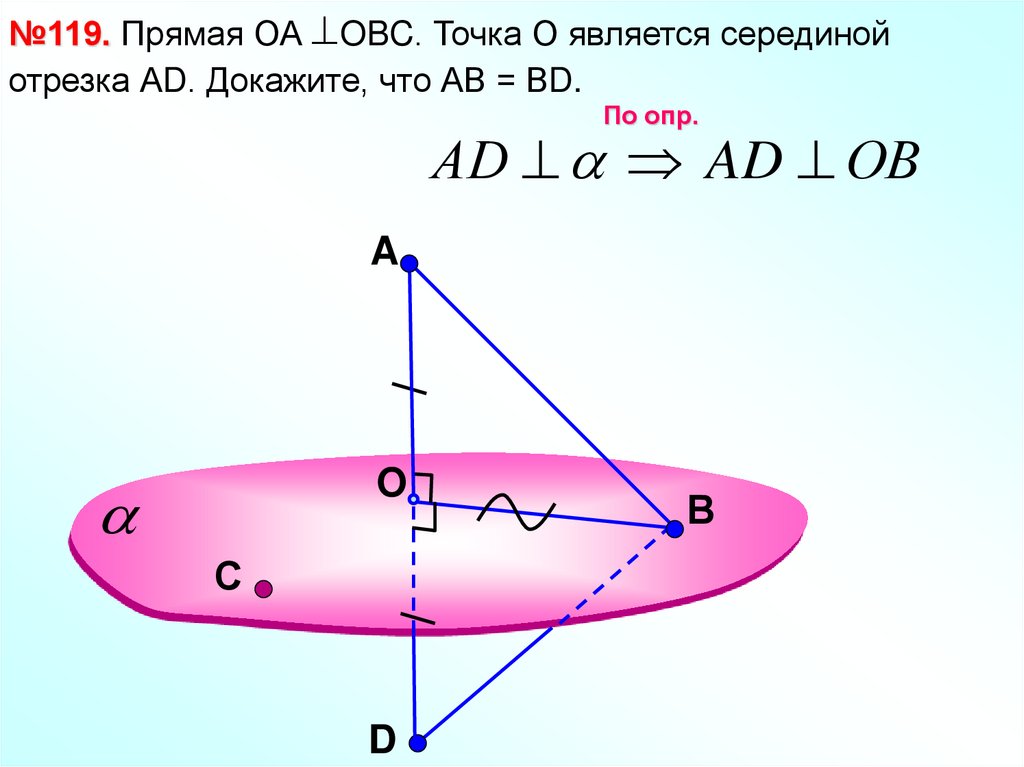 №119. Прямая ОА OBC. Точка О является серединойотрезка АD. Докажите, что АВ = ВD.
