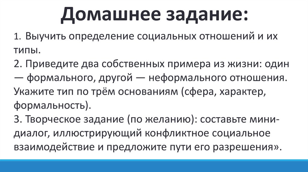 Домашнее задание:1. Выучить определение социальных отношений и их