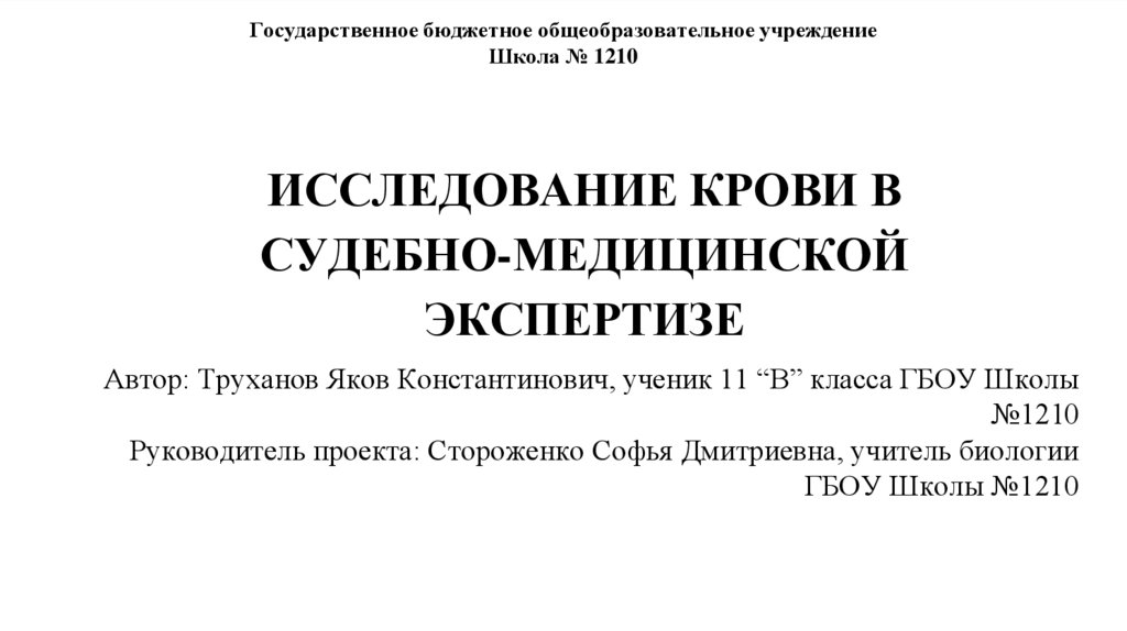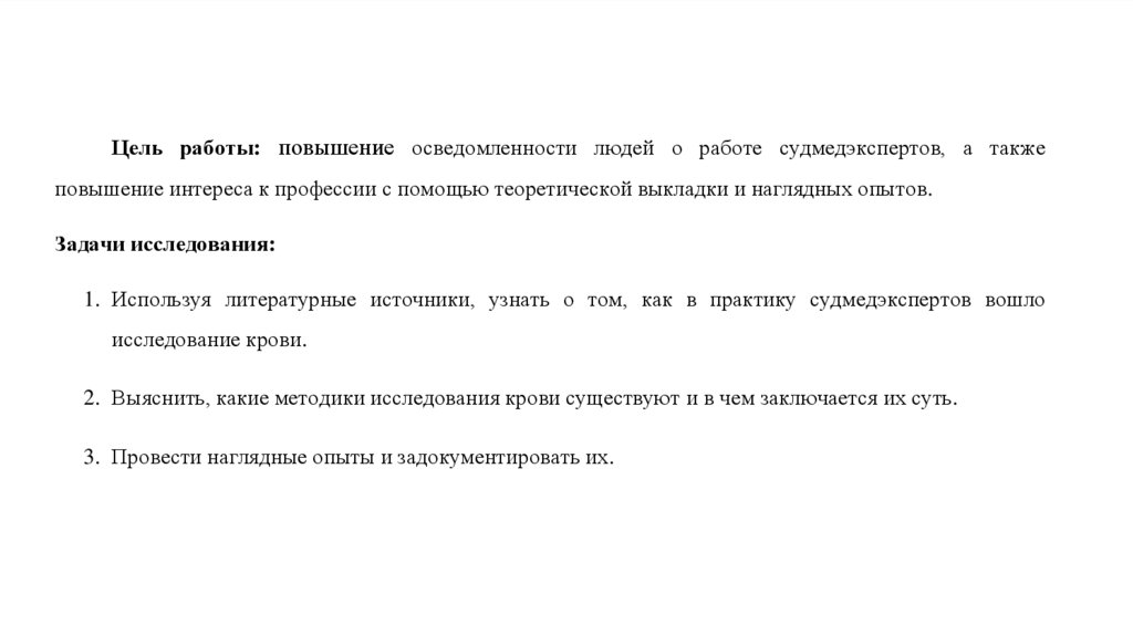Цель работы: повышение осведомленности людей о работе судмедэкспертов, а такжеповышение интереса к профессии с помощью теоретической выкладки и наглядных опытов.