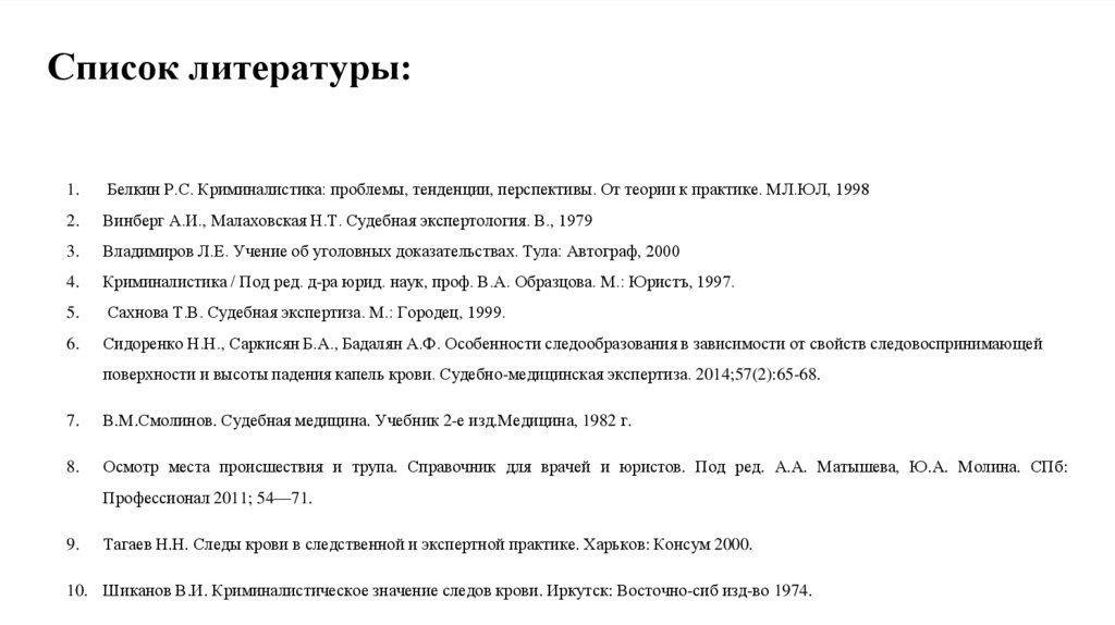 10. Шиканов В.И. Криминалистическое значение следов крови. Иркутск: Восточно-сиб изд-во 1974.