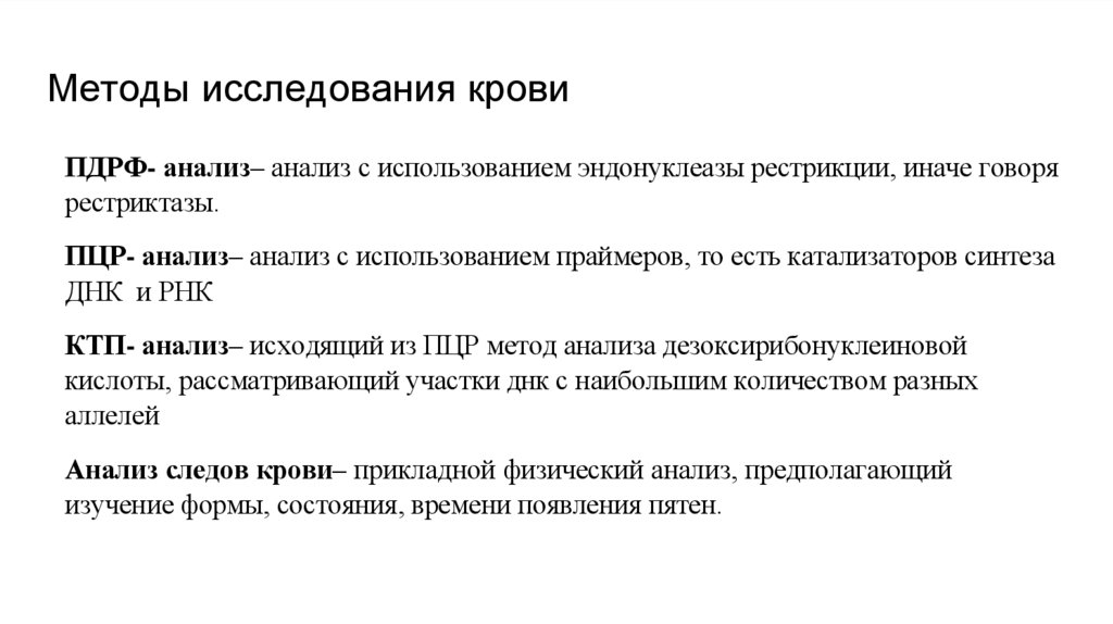 Методы исследования кровиПДРФ- анализ– анализ с использованием эндонуклеазы рестрикции, иначе говоря