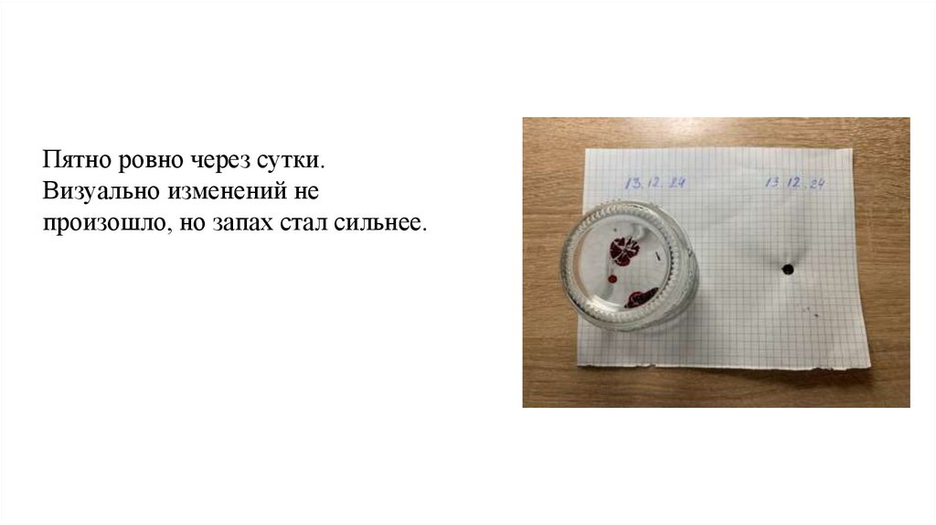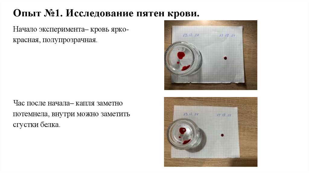 Опыт №1. Исследование пятен крови.Начало эксперимента– кровь яркокрасная, полупрозрачная.