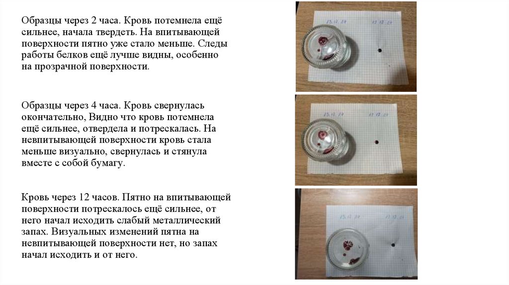 Образцы через 2 часа. Кровь потемнела ещёсильнее, начала твердеть. На впитывающей