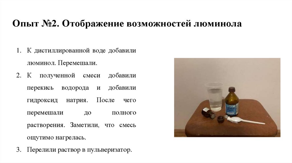 Опыт №2. Отображение возможностей люминола1. К дистиллированной воде добавили