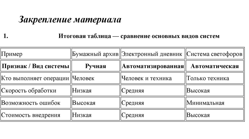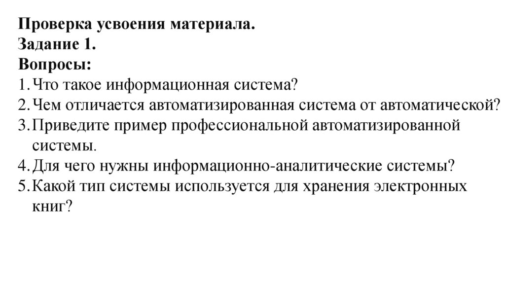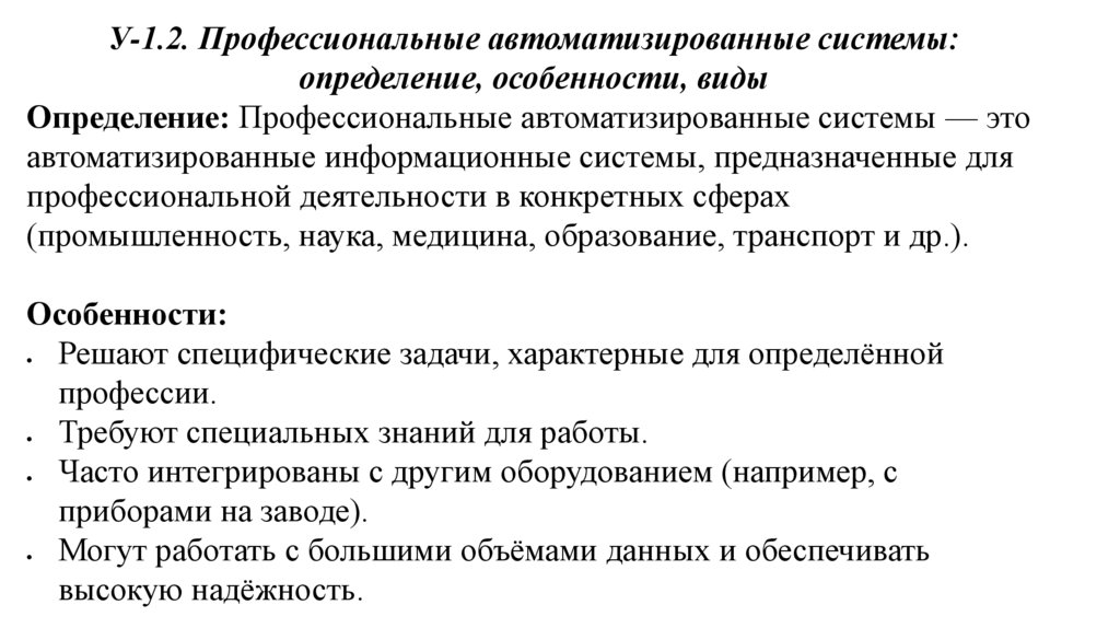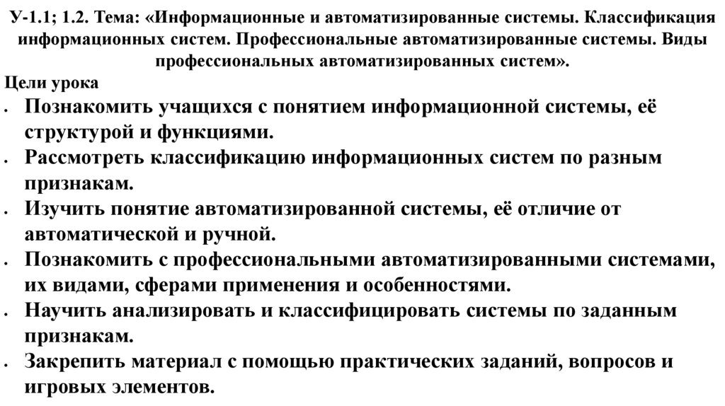У-1.1; 1.2. Тема: «Информационные и автоматизированные системы. Классификацияинформационных систем. Профессиональные автоматизированные системы. Виды