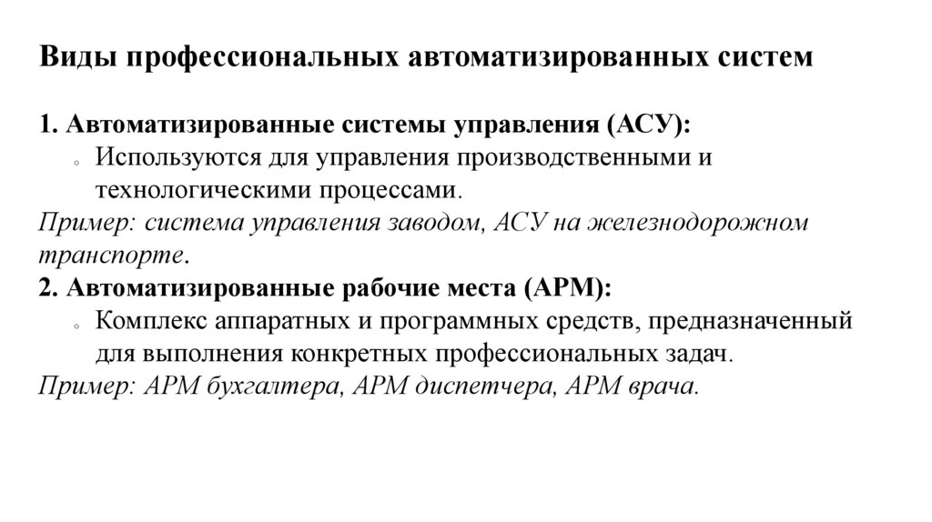 Виды профессиональных автоматизированных систем1. Автоматизированные системы управления (АСУ):