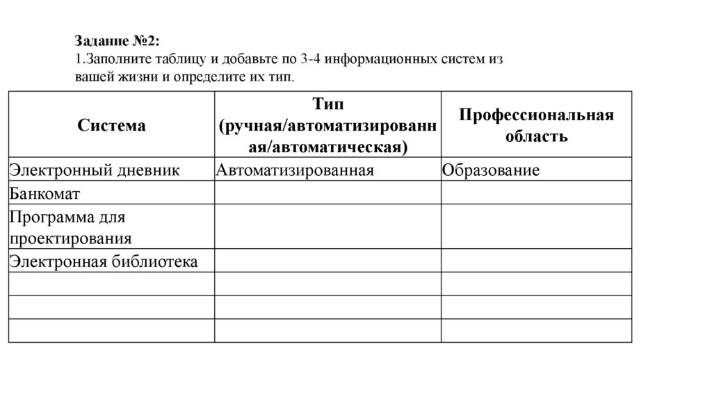 Задание №2:1.Заполните таблицу и добавьте по 3-4 информационных систем из